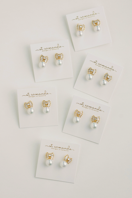 Gold Pearl Sparkler Holiday Statement Bow Earrings