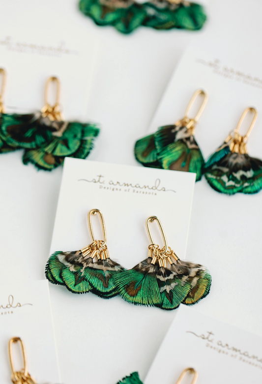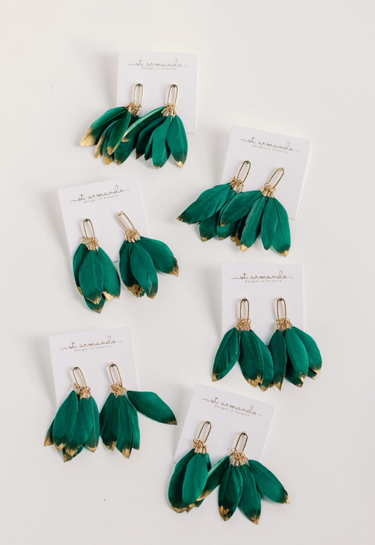 Emerald Gold Dipped Fall Feather Tassel Statement Earrings