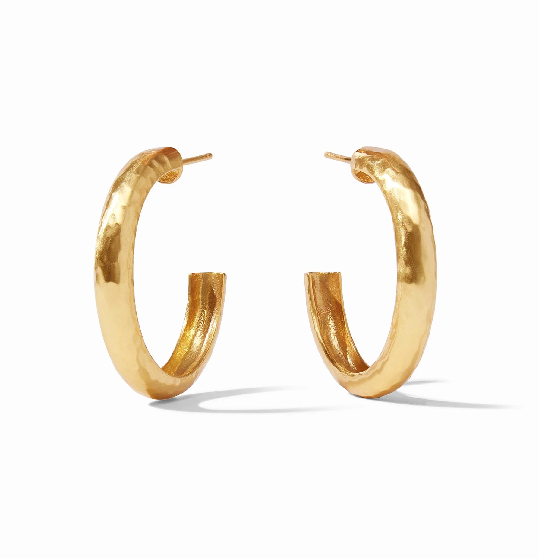 This golden hoop's lightly hand-hammered finish belies its simplicity by catching and scattering light for maximum impact.
