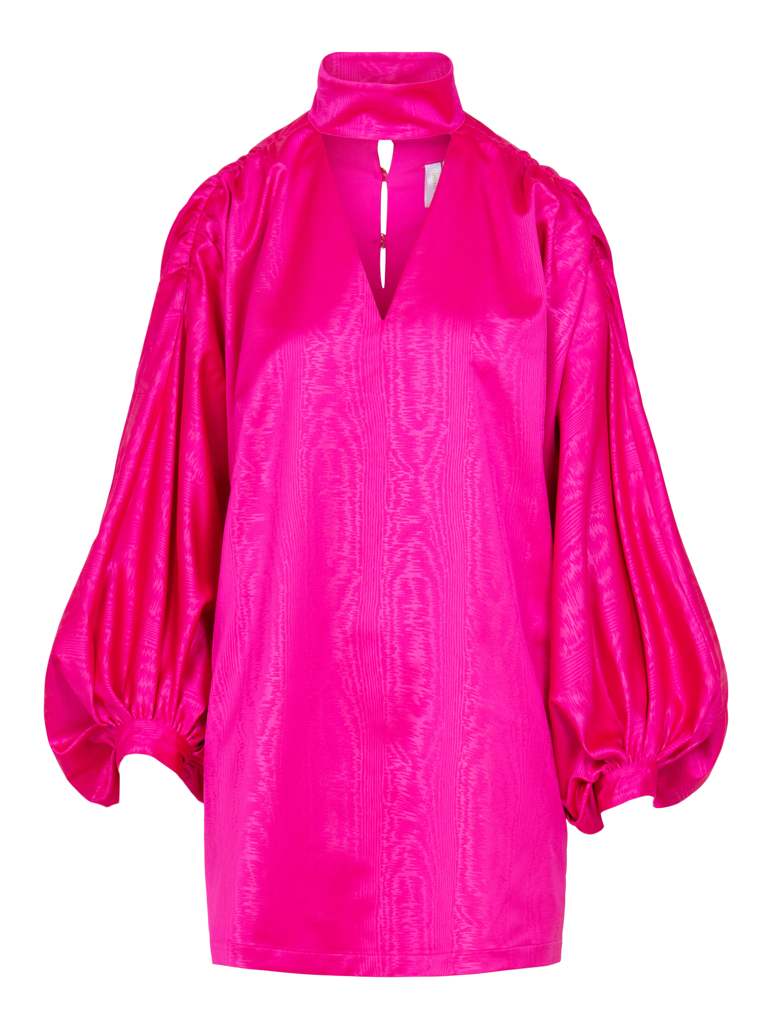 The Sasha Mini in Pink Faux Bois features a keyhole neckline, dramatic blouson sleeves, and a relaxed silhouette. Designed in a structured wood-grain inspired fabric, this bold pink style holds its shape while still offering fluid movement. A true statement piece, it’s the perfect mix of playful and polished for every party on your calendar.